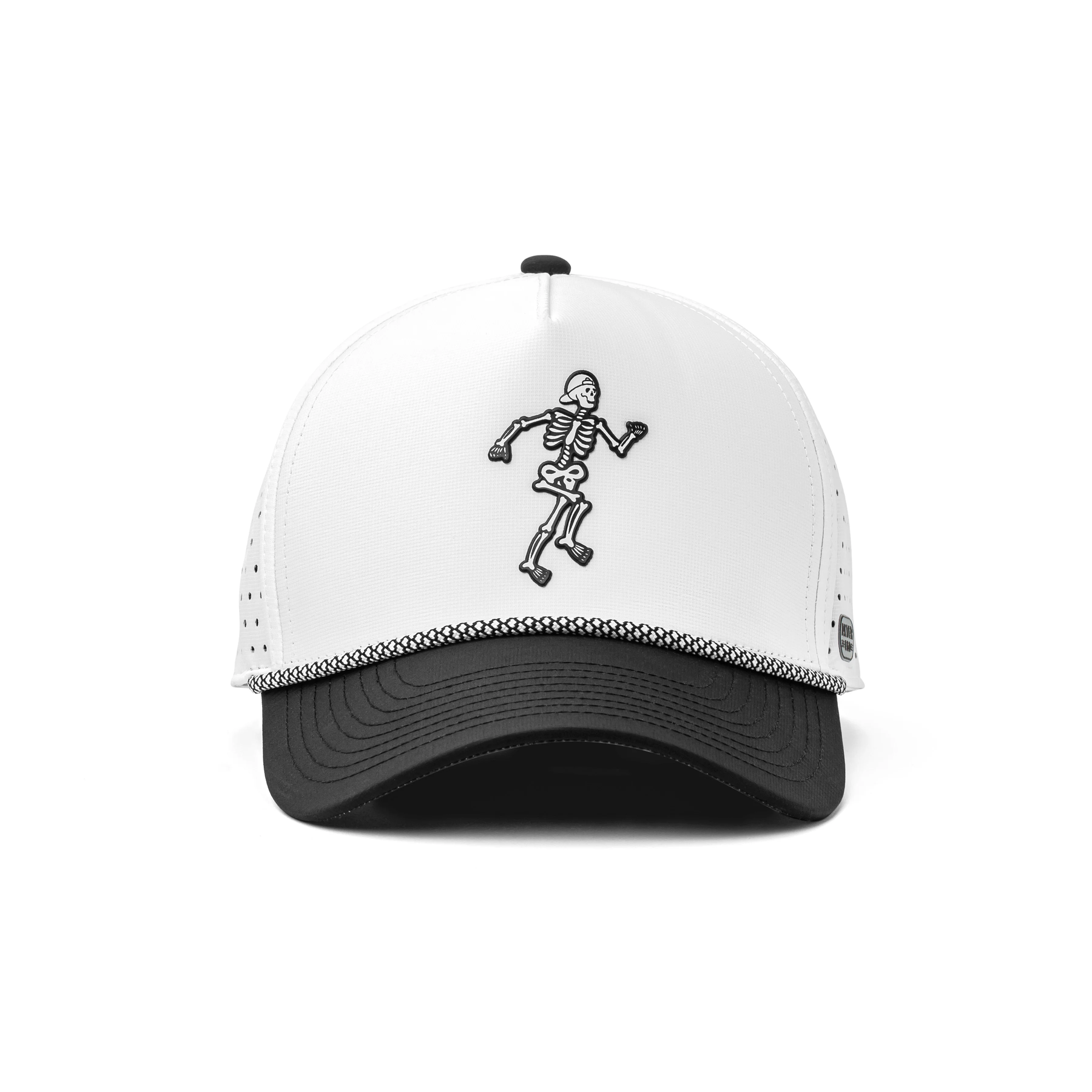 Interior and back view of a white hat with black mesh panels, an adjustable strap, and perforated sides for optimal airflow and functionality.